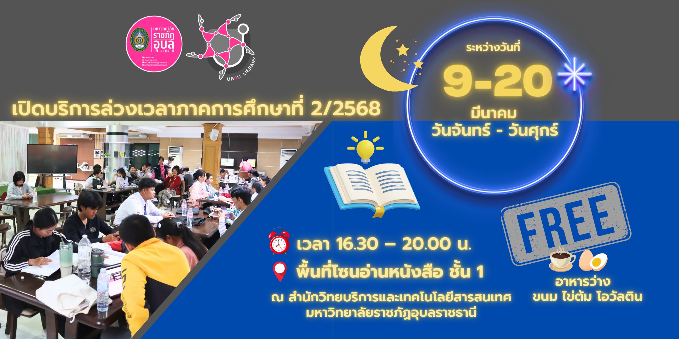 สำนักวิทยบริการฯ เปิดบริการล่วงเวลา ภาคการศึกษาที่ 2/2568 เพื่ออำนวยความสะดวกแก่นักศึกษา อาจารย์ และบุคลากรในการค้นคว้า อ่านหนังสือ และยืม–คืนทรัพยากรสารสนเทศนอกเวลาปกติ