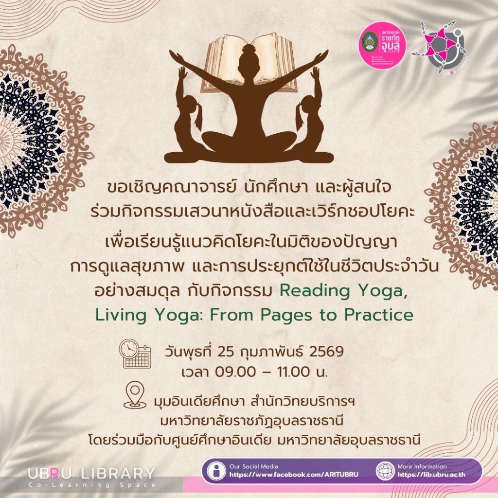📣 ขอเชิญคณาจารย์ นักศึกษา และผู้สนใจ ร่วมกิจกรรมเสวนาหนังสือและเวิร์กชอปโยคะ Reading Yoga, Living Yoga: From Pages to Practice