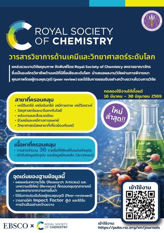 ข่าวดีสำหรับสายวิจัยและการเรียนรู้! สำนักวิทยบริการฯ ขอประชาสัมพันธ์การเปิดทดลองใช้งานฐานข้อมูลวารสารระดับนานาชาติจาก Royal Society of Chemistry (RSC)