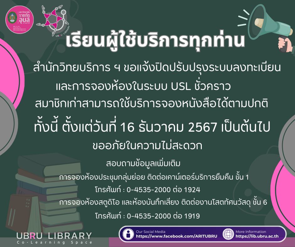 2. สำนักวิทยบริการฯ ขอแจ้งปิดปรับปรุงระบบลงทะเบียนและการจองห้องในระบบ USL ชั่วคราว