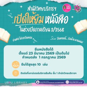 โอกาสดีสำหรับนักอ่าน! 📖 ยืมหนังสือไปอ่านได้ยาวๆ ตลอดช่วงปิดภาคเรียน 📚✨ สำนักวิทยบริการฯ เปิดให้ยืมหนังสือช่วงปิดภาคเรียน 2/2568 📌 รายละเอียดการให้บริการ • 📅 เริ่มยืมได้ตั้งแต่ 23 มีนาคม 2569 เป็นต้นไป • ⏳ กำหนดส่ง